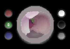 To achieve the tile lighting, "refraction map" UV lookup textures were pre-baked in Blender. The GLSL fragment shader samples nine refraction maps (representing adjacent tiles) for every glass pixel and determines which background colors to propagate.