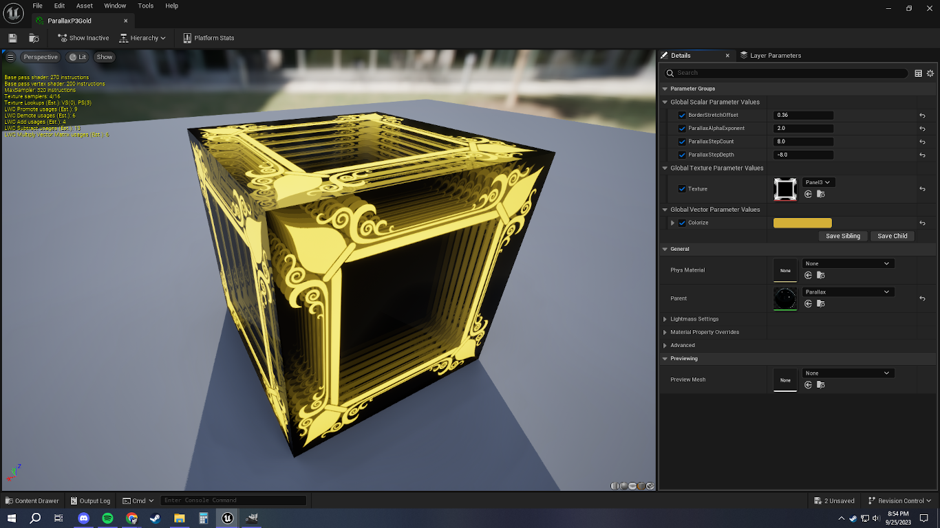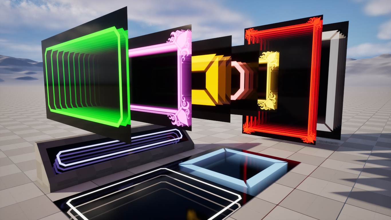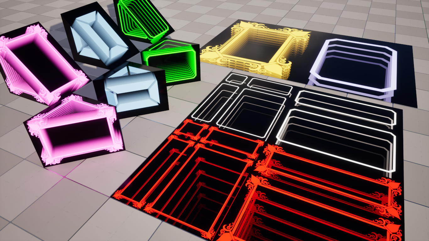 This project is a content plugin for Unreal Engine 5.3 that adds infinity mirror-style parallax materials. The base material is highly configurable and exposes parameters for: base texture, colorization, number of parallax layers, world-space distance between parallax layers, and more.